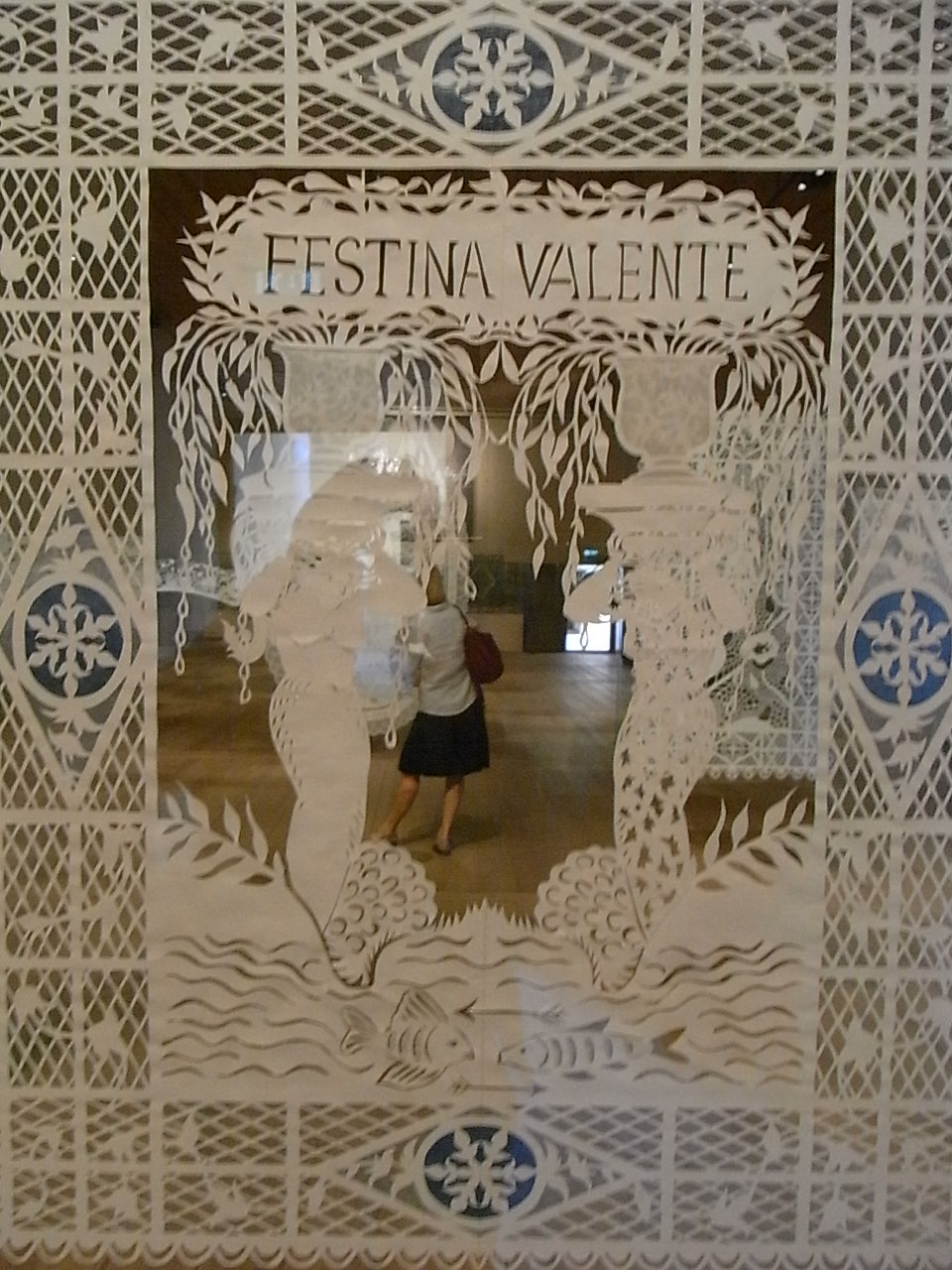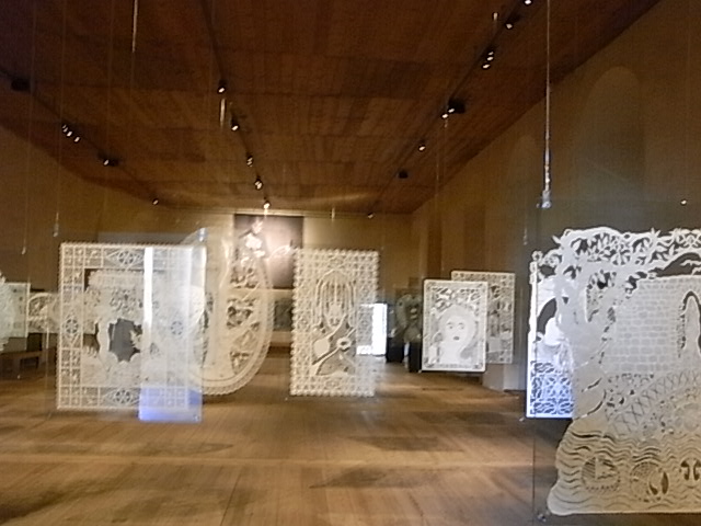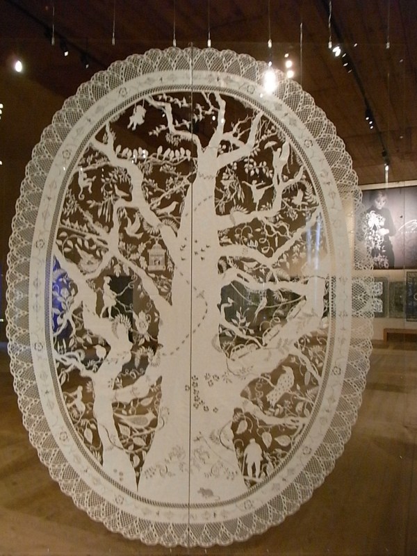 Bueno, pues la tijera la pone, ahora que los países nórdicos son un oasis de entendimiento y colaboración pacífica, una artista danesa, Karen Bit Vejle, que ha conquistado el “salón quemado” del castillo de Kalmar, con el encantamiento del papel y las sombras de sus creaciones de Psaligrafía, el arte del papel recortado que, se cuenta, llegó de China hacia el año 1300 (la foto está tomada del vídeo que se proyecta en la exposición)