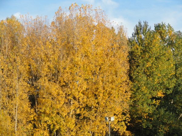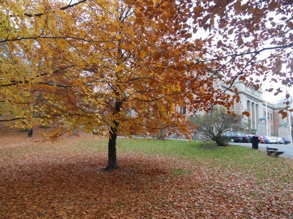 Como no he podido ir en estos días a Småland, donde los campos roturados del otoño, lo puedo asegurar, parecen tierras mezcladas con sangre seca, no he podido fotografiar aquellos llanos y bosques que inspiraron a Tranströmer y que vieron las luchas de los campesinos católicos contra el rey luterano, así que me tengo que contentar con una foto de los campos de labranza como se ven estos días al sur de Gotemburgo y del otoño en la ciudad, justo junto a la fachada de la universidad