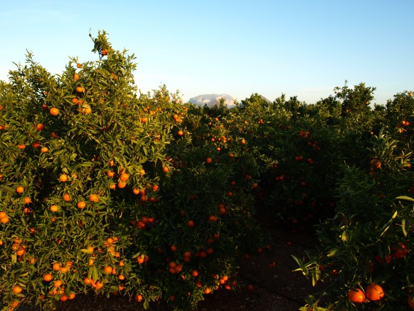Por los llanos costeros de la Comunidad Valenciana no es el de los viñedos despojados sino el color de las naranjas en sazón lo que domina el paisaje.