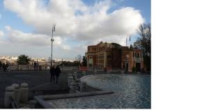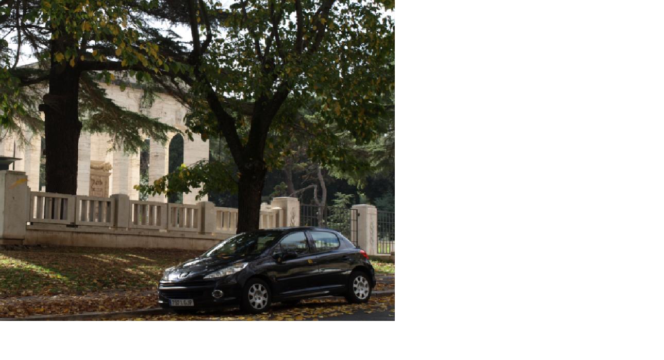 Si se asciende con el coche al Gianícolo, para disfrutar de la vastisima visión de Roma , conviene hacerlo en fin de semana para aparcar arriba sin problema y luego, descendiendo por la via Garibaldi, detenerse acaso frente a la Academia de España, en la acera del osario de los combatientes de la citada batalla entre el ejército de Garibaldi y las fuerzas franco-papistas (lo cual se demuestra en la instantánea de mi bólido aparcado holgadamente delante del Mausoleo).