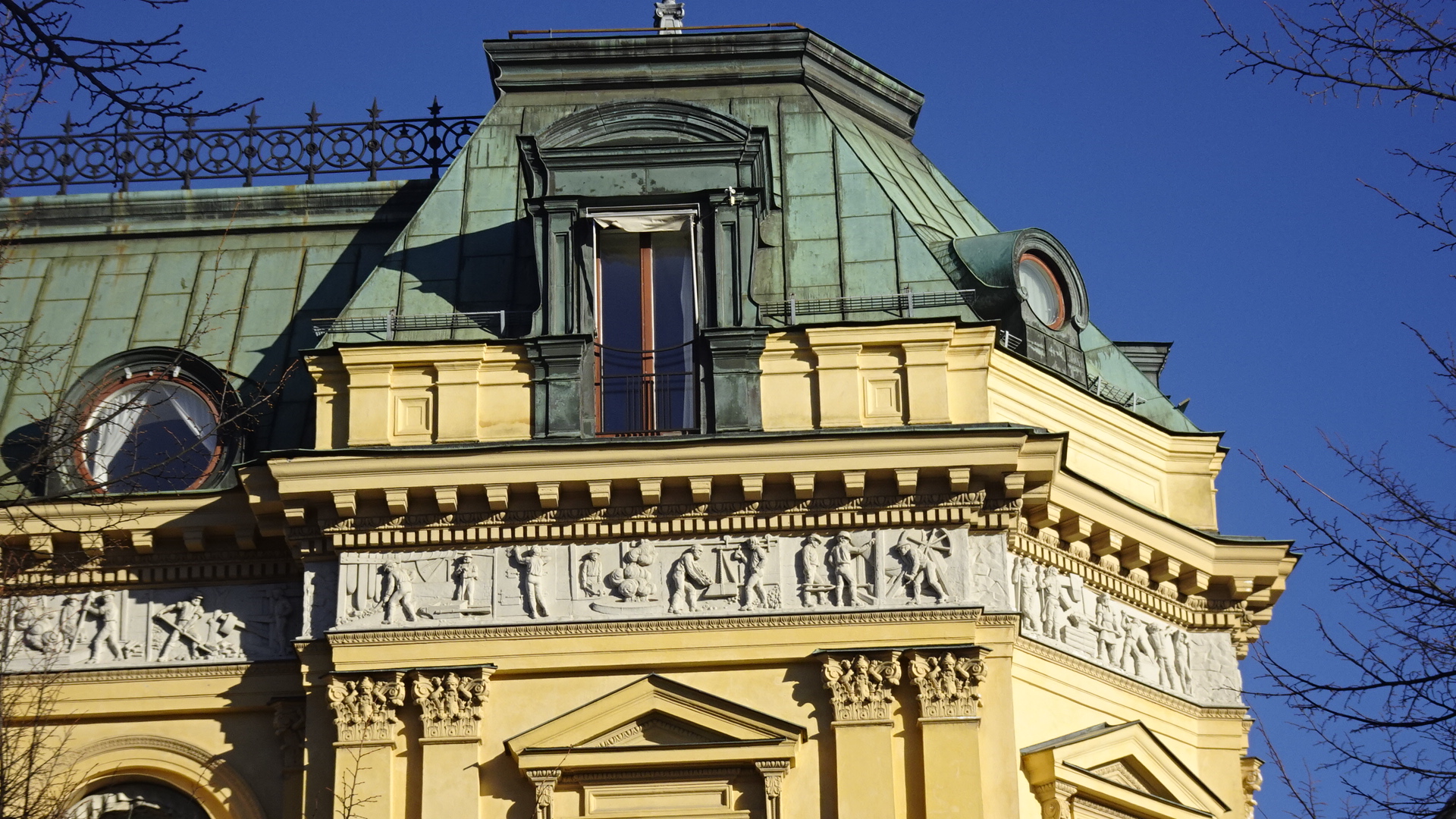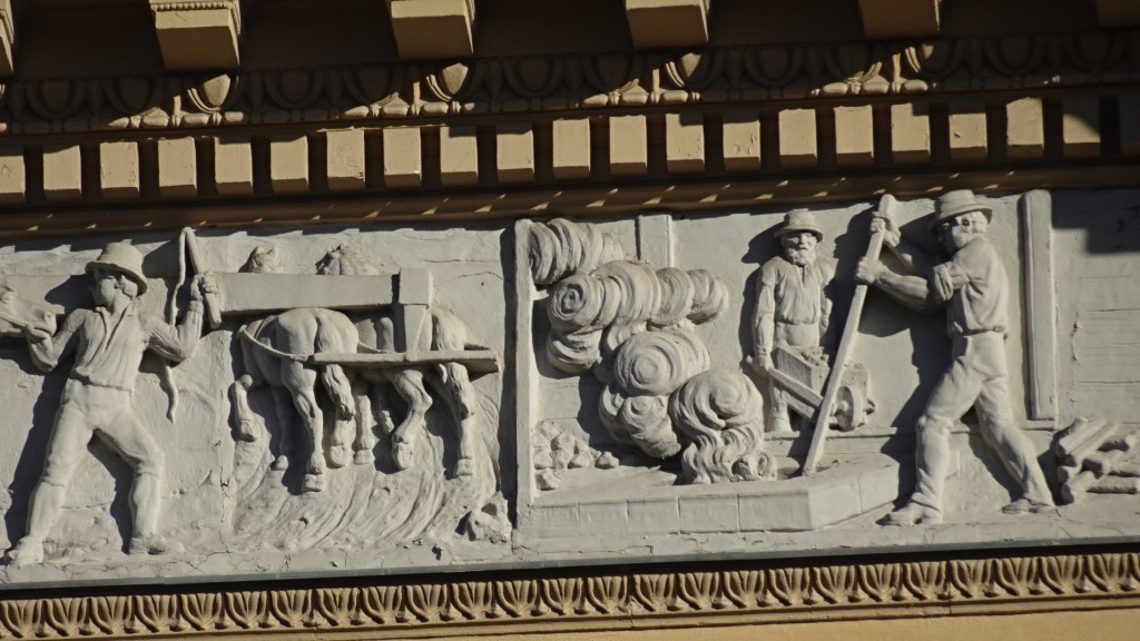 Sobre una de las fachadas soleadas del parque hay un largo friso con las escenas de los varios oficios y artes del trabajo manual.