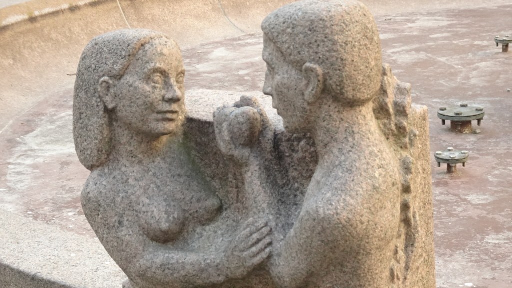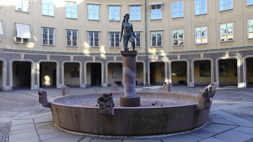 En su centro destaca una hermosa escultura en bronce titulada La mañana, obra de Ivar Johnssons (1985 -1970). La escoltan otras escenas en piedra sobre la balaustrada de un estanque, ahora sin agua. Estamos en la Brantingtorget (Plaza Branting), solos en este rincón. Aquí el domingo discurre en absoluta calma.