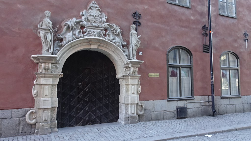 Al adentrarnos en la Ciudad Vieja (Gamla stan) despierta nuestra curiosidad un estrecho callejón empedrado, por el que no se interesa la riada de turistas que inundan la vía principal; de su acera derecha salimos hacia una bella plaza circular con soportales de aire neoclásico.