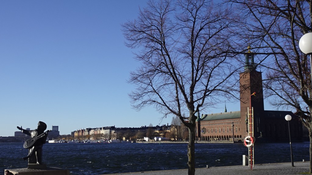 Nuestro paseo se acercará a sus fin, otra vez frente a las aguas sobre las que se alza la Stadhuset, es decir la casa consistorial de la ciudad. A la izquierda de la foto puede apreciarse la escultura en bronce de Ebert Taube (1890-1976), el más famoso cantautor, trovador y músico de la Suecia moderna.