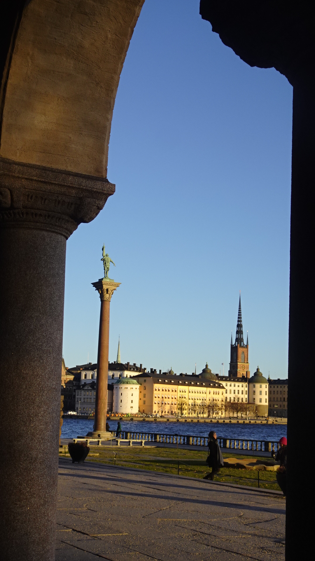 Más allá, también percibimos la flecha de la misma Riddarsholmens kyrkan, junto a la que ya hemos pasado antes, una perspectiva que simbólicamente enfrenta al venerado rebelde, eternizado sobre la columna, con aquel rey de quien ya nadie se acuerda, enterrado en la cripta de esa iglesia.