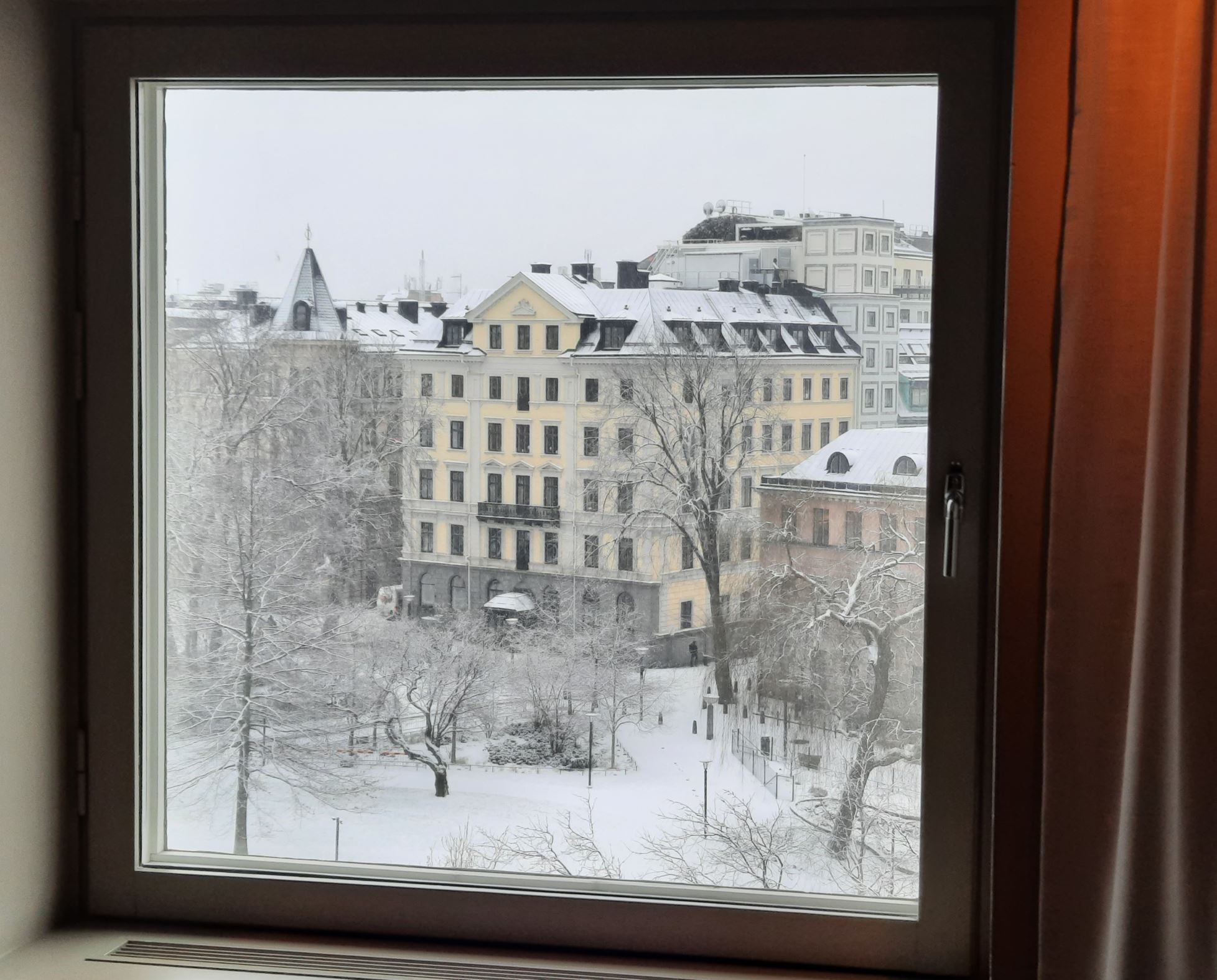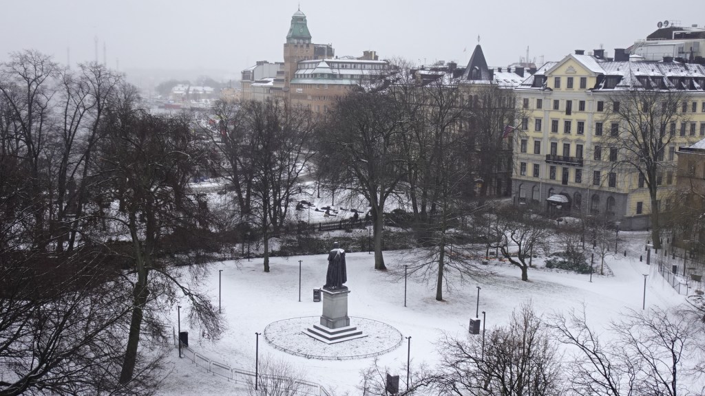 El sábado 18 de febrero nevó en Estocolmo. Desde la ventana del hotel el Berzelii Park ofrecía el aspecto que encabeza esta segunda crónica de los cinco días que pasamos en la capital de Suecia. El nombre se lo debe el parque al científico Jöns Jacob Berzelius (1779–1848), el Padre de la Química Sueca, al que le habría gustado ver su solemne efigie coronada de blanco.